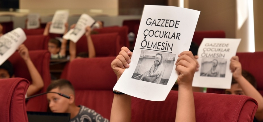 Cumhuriyet Meclisi Genel Kurul salonunda “Gazze’deki Çocuklar Ölmesin” konulu temsili bir toplantı yapan bir grup çocuk, “Savaşlar olmasın, çocuklar ölmesin” çağrısında bulundu.