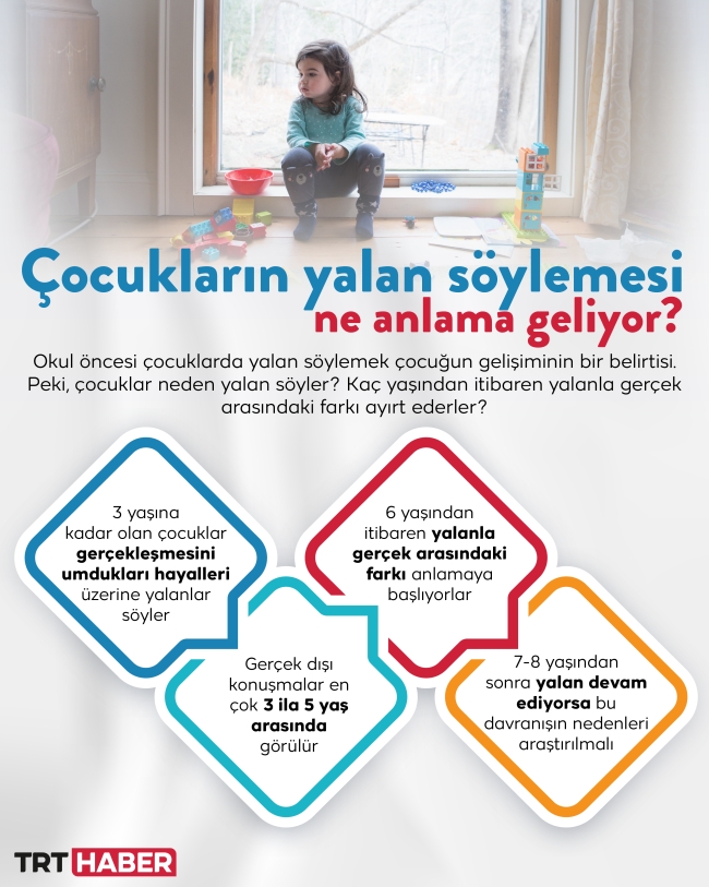 "Her yaş grubuna göre yalan söylemek farklı bir anlam taşımaktadır. 3 yaşa kadar olan dönemde çocuklar yalan konuşsalar da altında gerçekleşmesini umdukları, hayalleri olabilmektedir. 3-5 yaş arasında hayalle gerçeği ayırt edememeleri devam ederken yalan söyleme davranışı başlar. Çocuklar, duygularının dışa aktarımında büyük önem taşıyan oyun oynama sürecinde de hayal güçlerinin etkisiyle yalan konuşabilmektedirler. Bu dönemde gerçek dışı konuşmalar sık görülür. Çocuğun gerçeklik duygusunu zamanla oluşturacağının farkında olmak gerekir. 5-6 yaş itibari ile artık yalan kavramının farkındalığı oluşmaya başlamıştır. Birini yanıltmanın iyi bir davranış olmadığının farkına varırlar. 10-11 yaş sonrası artık yalan konusunda becerileri artmıştır."