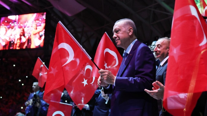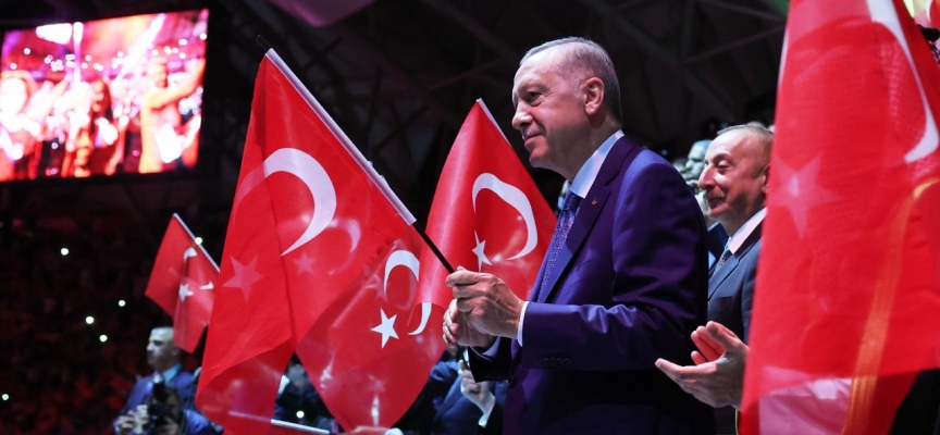 Saha zemininde sergilenen Türkiye'nin güzellikleri ile Türk bayrağı koreografilerini izleyen Cumhurbaşkanı Erdoğan, 56 ülke takımlarının geçit törenini de takip etti.