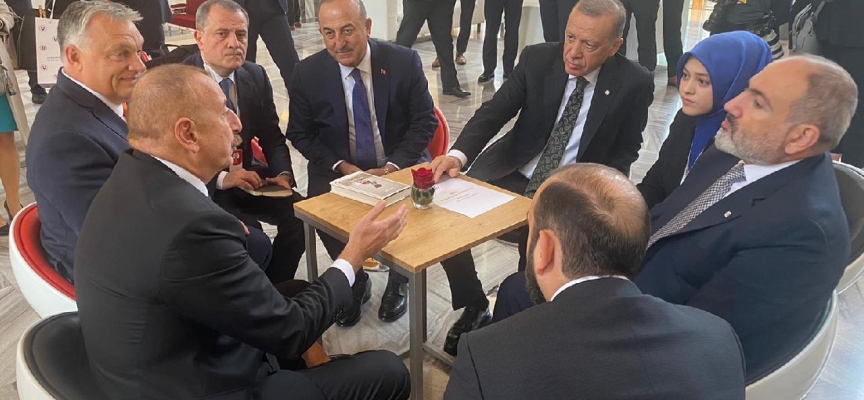 Toplantının yapılacağı Prag Kalesi'ne gelen Cumhurbaşkanı Erdoğan, fuaye alanında Azerbaycan Cumhurbaşkanı İlham Aliyev ve Ermenistan Başbakanı Nikol Paşinyan ile bir süre sohbet etti.