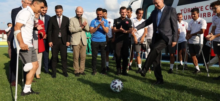 Cumhurbaşkanı Erdoğan, "Sanayi ve Teknolojinin Merkezi Kocaeli'ye Değer Katanlar Ödül Töreni" ile "TOKİ Konutları, KYK Yurtları, Büyükşehir Belediyesi Yatırımları ve Fabrikaları ile Yapımı Tamamlanan Diğer Projelerin Toplu Açılış Töreni" için geldiği Kocaeli'de, kamp yapan Ampute Milli Futbol Takımına ziyarette bulundu.