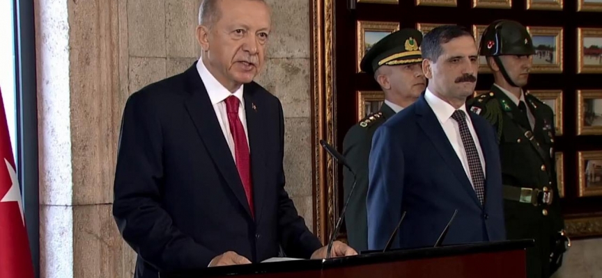 Erdoğan'ın ay yıldız motifli çelengi Atatürk'ün mozolesine bırakmasının ardından saygı duruşunda bulunuldu, İstiklal Marşı okundu.