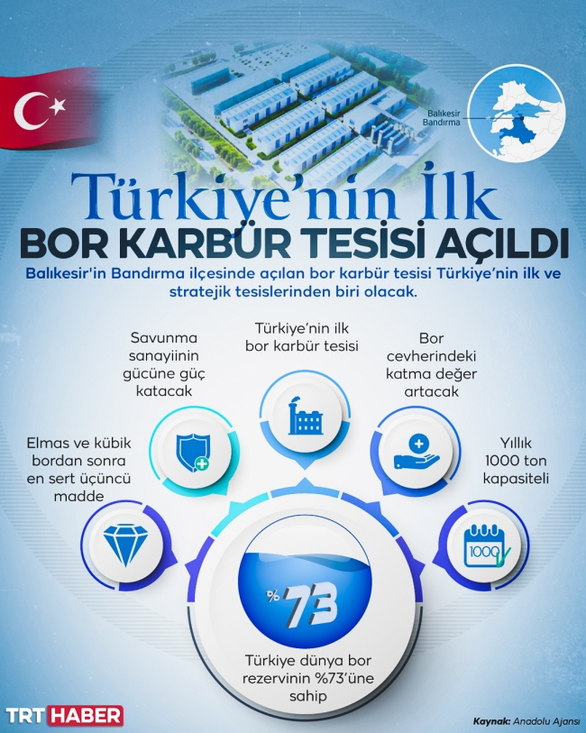 Uçaklardan taktik araçlara, personel yeleklerinden korunaklı levhalara kadar pek çok yerde bu ürünü görmenin mümkün olduğunu dile getiren Erdoğan, "Bandırma tesisimizde yapılacak yıllık 1000 ton üretim, kullanıldığı alanlarda da 150 kattan 2 bin kata kadar varan değer artışları sağlamaktadır. Bir başka ifadeyle bu tesis sayesinde Türkiye, sadece sahip olduğu bor madeninin katma değerini yükseltmekle kalmıyor aynı zamanda ülkemiz, dünyanın en sert üçüncü malzemesinin üretiminde ve satışında önemli bir oyuncu haline geliyor." ifadesini kullandı.