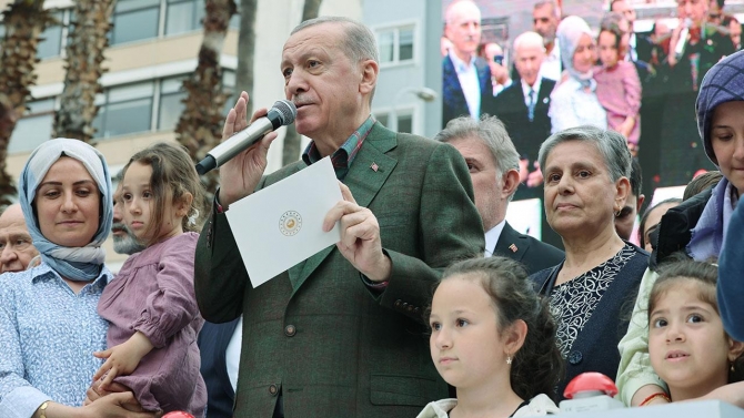 İşte biz bunun için bir yılda 319 bin konut yaparak, alt yapısı ile, iş yerleri, sosyal ve kültürel birimleri ile tüm ihtiyaçlarını tamamlayarak şehirlerimizi ayağa kaldırma sözü verdik. Seçimleri daha önce açıkladığımız 14 Mayıs'ta yapma kararımızın gerisinde de aynı anlayış vardır. Deprem bölgesinde yürüttüğümüz çalışmalar seçim atmosferinden etkilenmesin bu iş bir an önce ülkenin gündeminden çıksın istedik. Bakanlıklarımızla, kurumlarımızla, belediyelerimizle, sivil toplum kuruluşlarımızla, özel sektörümüzle tam kapasite sahadayız.