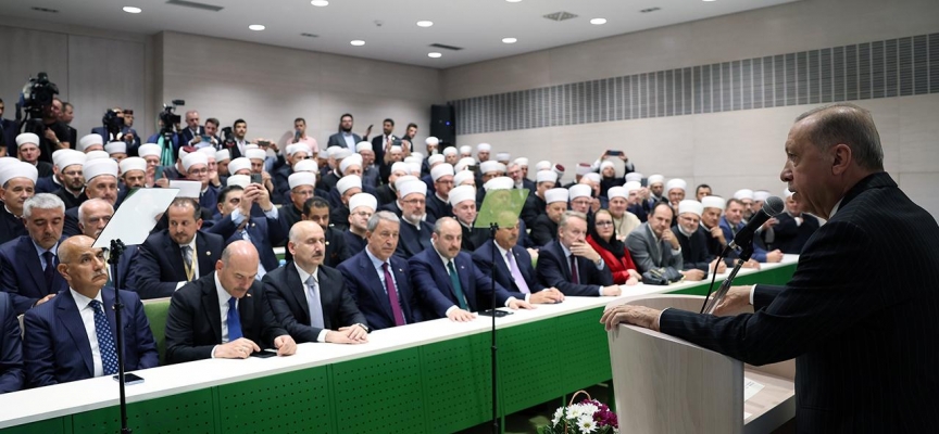 Burada davetlilere hitap eden Erdoğan, Aliya İzetbegoviç'ten sonra din adamlarına hitap eden ikinci Cumhurbaşkanı olduğu için mutluluk duyduğunu dile getirdi.