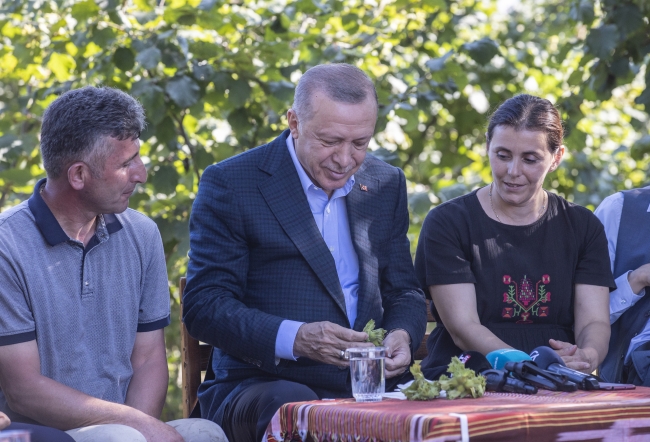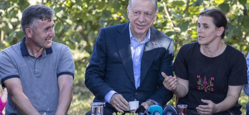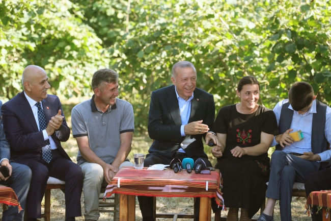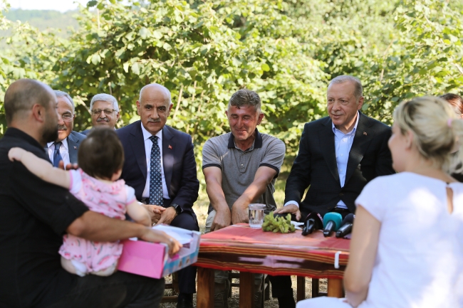 Fındık bahçesinde vatandaşlarla bir araya gelen Erdoğan, burada fındık üreticileriyle sohbet etti.