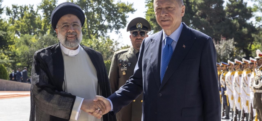 Tören kıtasını selamlayan Erdoğan ve Reisi, daha sonra tokalaşarak gazetecilere poz verdi.