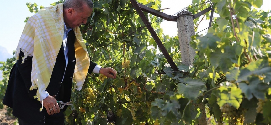 Daha sonra üzüm bağına geçen Erdoğan, eline makas alarak yılın ilk hasadını yaptı. Erdoğan vatandaşlarla hatıra fotoğrafı çektirdi, kendisine ilgi gösteren çocukları sevdi.