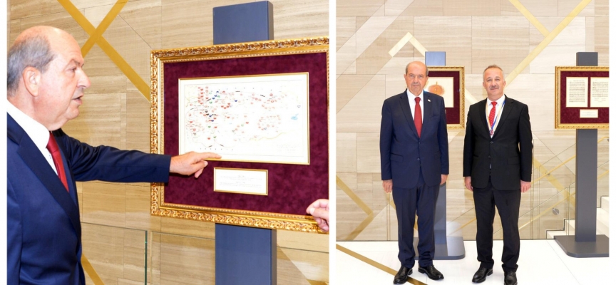 Cumhurbaşkanı Ersin Tatar’a, Türkiye Cumhuriyeti Devlet Arşivleri Başkanı Prof. Dr. Uğur Ünal eşlik ederek, 50 adet eserin yer aldığı sergi hakkında bilgi verdi.