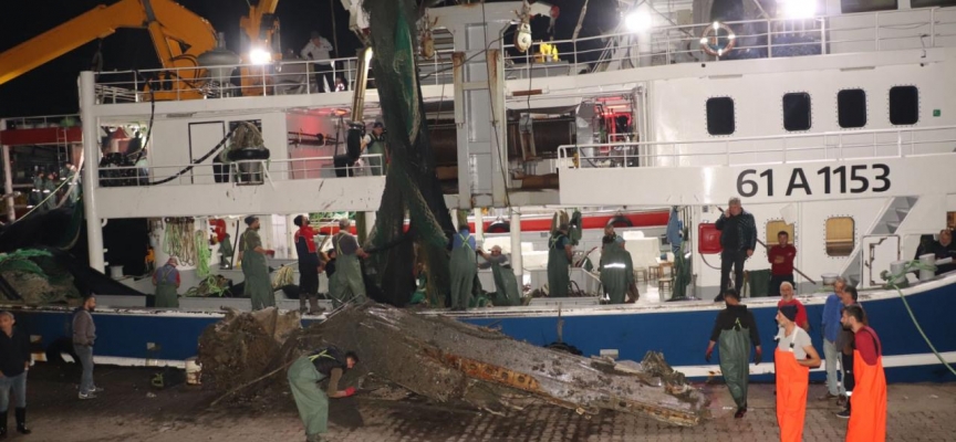 Uçak enkazı Ereğli Bozahane Limanı'na getirildi, daha sonra ağdaki parçalar temizlendi.