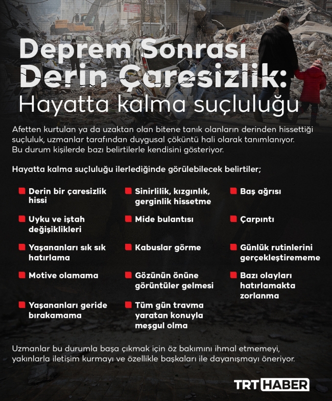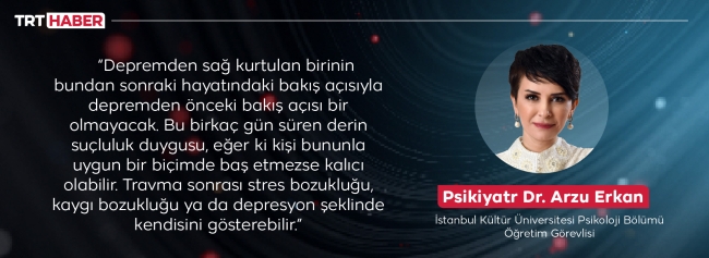 “Depremden sağ kurtulan birinin bundan sonraki hayatındaki bakış açısıyla depremden önceki bakış açısı bir olmayacak. Bizlerin de bakış açıları bir olmayacak. Bu birkaç gün süren derin suçluluk duygusu, eğer ki kişi bununla uygun bir biçimde baş etmezse kalıcı olabilir. Travma sonrası stres bozukluğu, kaygı bozukluğu ya da depresyon şeklinde kendisini gösterebilir.”