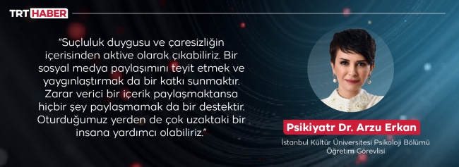 “Gücü neye yetiyorsa, koşulları neye el veriyorsa destek vermek, geride kalanlara, birbirine, kendisi gibi hissedenlere… Bu suçluluk duygusu ve çaresizliğin içerisinden aktive olarak çıkabiliriz. Aktive olmak demek kişinin çok büyük bir enerji ve istek hissederek yapması gerek anlamına gelmiyor. Kendi ruh sağlığını iyi tutmak ve kendine bakım vermek de bir çabadır. Bir sosyal medya paylaşımını teyit etmek ve yaygınlaştırmak da bir katkı sunmaktır. Zarar verici bir içerik paylaşmaktansa hiçbir şey paylaşmamak, yanlış bir şey konuşmaktansa hiç konuşmamak da bir destektir. Herkes gidip göçük altından bir canı kurtarmayı önemsiyor. Hepimiz önemsiyoruz. Ama oturduğumuz yerden de çok uzaktaki bir insana yardımcı olabiliriz.”