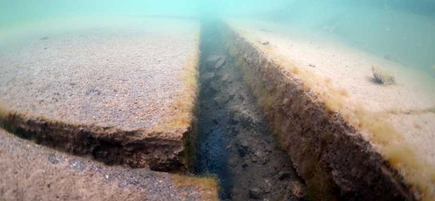 Kıyı şeridinde birçok alandan kopan kaya parçalarını saptayan Ceylan ve beraberindekiler, depremlerde yıkılan Arsuz Oteli'nin kıyısındaki dere yatağında fay hattının oluşturduğu tahribatı da görüntüledi.