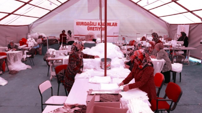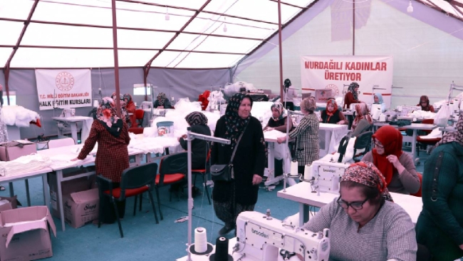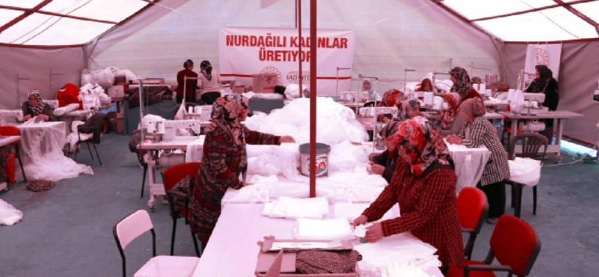 Gaziantep'in Nurdağı Halk Eğitimi Merkezi'nde Usta öğretici ve kursiyerlerden oluşan 25 kadın, acılarına rağmen ürettikleriyle depremzedelerin ihtiyaçlarını karşılıyor.