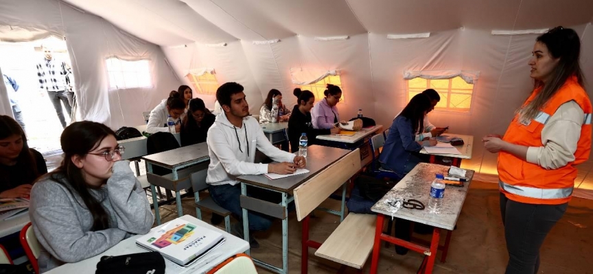 Hatay'ın Samandağ ilçesinde yaşayan gönüllü öğretmenler, kurdukları çadır sınıflarda Liselere Geçiş Sistemi (LGS) sınavı ve Yükseköğretim Kurumları Sınavı'na (YKS) hazırlanan öğrencilere eğitim desteği veriyor.
