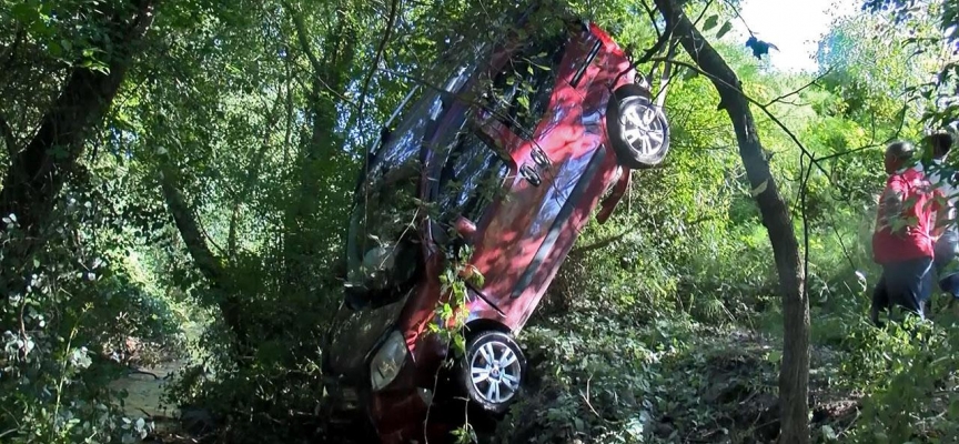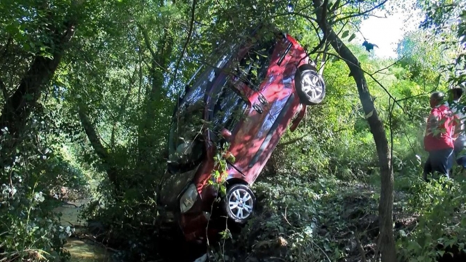 Dereye düşen otomobilde bulunan iki kişi, kazayı yara almadan atlattı. Hasar gören otomobil vinç yardımıyla çıkarıldı.