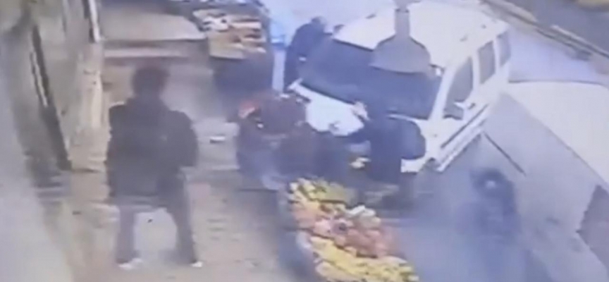 Yolda yürüyen 2 kadın kaçarak, hafif ticari aracın kendilerine çarpmasından saniyelerle kurtulurken, okula giden bir öğrenci ise araç ile manav tezgahı arasında kalıp savruldu.