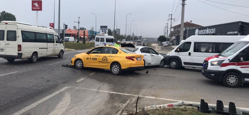 D-100 kara yolu Ankara istikametinde seyreden Muharrem G. idaresindeki 54 AFF 779 plakalı otomobil, ışıklı kavşakta Atatürk Devlet Hastanesi yönüne gitmeye çalışan Nabi O. yönetimindeki 81 T 1995 plakalı taksi ve Feyyaz Y'nin kullandığı 81 AK 455 plakalı panelvanla çarpıştı.