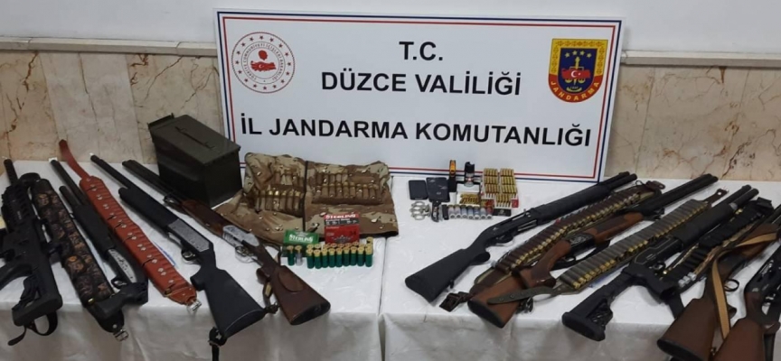 Şüphelilerin ev ve eklentileri ile ormanlık alana kaçan şüphelilerin takibi sonrası arazide yapılan aramalarda, 9'u av tüfeği 10 silah, fişek ve mermiler ile avcı hücum yeleği ele geçirildi.