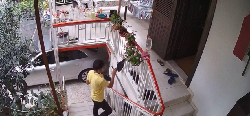 Öte yandan şahsın eve girişi ve hırsızlık yapma anları güvenlik kameraları tarafından saniye saniye görüntülendi. Rahat bir şekilde eve giren şüpheli, önce ayakkabıları çalmak için hamle yapıyor.