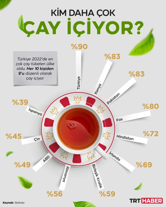 Güzel sohbetlerin tamamlayıcısı, misafirliklerin vazgeçilmezi denilince Türkiye’de akla ilk çay geliyor. Sabah kahvaltısında ya da akşam yemeği sonrasında günün hemen her vakti çay tüketiliyor. Nitekim Statista’nın araştırması da bunu doğrular nitelikte… Söz konusu araştırma 56 ülkeyi kapsıyor. En fazla çay tüketen ülkeler sıralamasında başı ise Türkiye çekiyor. Araştırmaya göre Türkiye’de çay içme oranı yüzde 90.