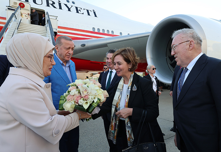 Cumhurbaşkanı Erdoğan’ın beraberinde eşi Emine Erdoğan, Dışişleri Bakanı Hakan Fidan, Hazine ve Maliye Bakanı Mehmet Şimşek, Enerji ve Tabii Kaynaklar Bakanı Alparslan Bayraktar, Ticaret Bakanı Ömer Bolat, Çevre, Şehircilik ve İklim Değişikliği Bakanı Mehmet Özhaseki, Aile ve Sosyal Hizmetler Bakanı Mahinur Özdemir Göktaş, Sanayi ve Teknoloji Bakanı Mehmet Fatih Kacır, MİT Başkanı İbrahim Kalın, Cumhurbaşkanlığı İletişim Başkanı Fahrettin Altun, Cumhurbaşkanı Başdanışmanı Büyükelçi Akif Çağatay Kılıç, AK Parti Genel Başkanvekili Binali Yıldırım, AK Parti Sözcüsü Ömer Çelik ve bazı yetkililer de yer alıyor.