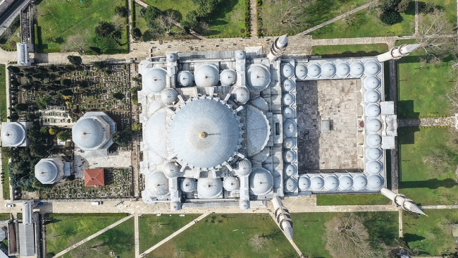 Ayasofya'dan daha büyük olan kubbesi, 6 metre genişliğindeki kemerlerle birbirine bağlanan 8 büyük filpayeye oturuyor. Köşelerde dört, mihrap yerinde bir yarım kubbe merkezi kubbeyi destekliyor.