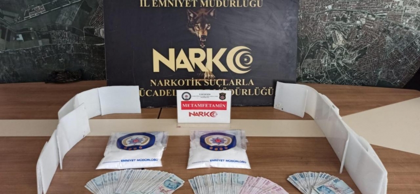 Gözaltına alınan şüphelilere ait iki valizin astarlarının içine zulalanmış 2 kilo 666 gram metamfetamin ele geçirildi.