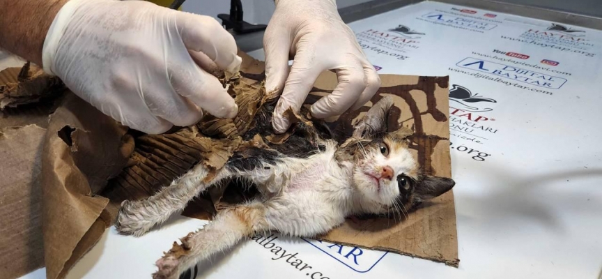 Sosis parçaları konulup, fare yapışkanı sürülen kartonun üzerindeki yavru kediyi görenler, durumu Osmaniye Belediyesi'ne bildirdi.