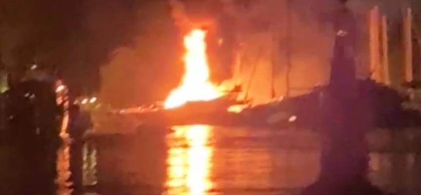 Öte yandan, aynı iskelede bağlı bulunan Türk bayraklı "Adastra" isimli yelkenli teknede, motor yattan alevlerin sıçraması sonucu çıktığı değerlendirilen yangın da itfaiye ekiplerince söndürüldü.