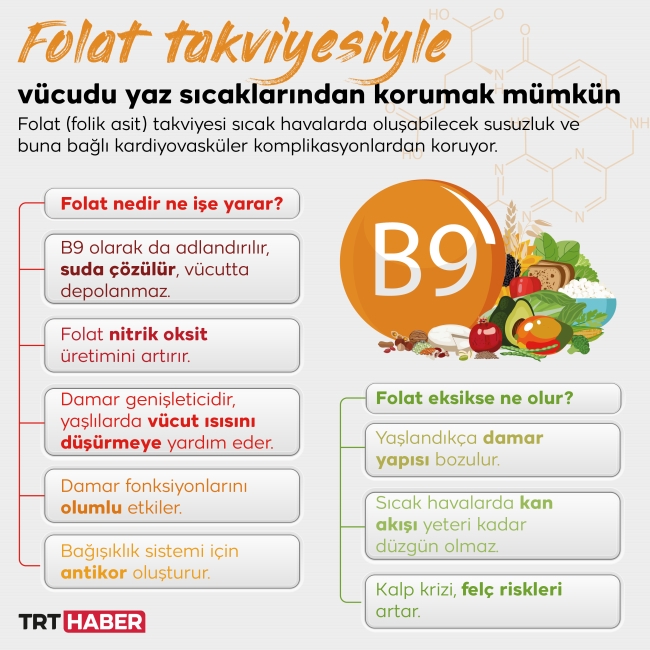 “Son yıllarda yapılan çalışmalar yaşlılarda folat (folik asit) takviyesinin sıcak havalarda oluşabilecek susuzluk ve buna bağlı kardiyovasküler komplikasyonlardan koruduğunu göstermiştir.”