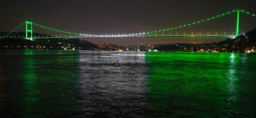 Yeşil ve beyaz renklerle aydınlatılan FSM Köprüsü, Sarıyer’den görüntülendi.