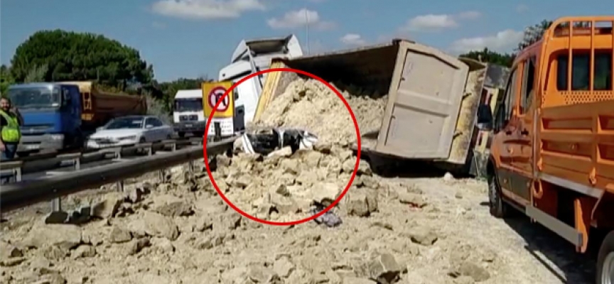 Büyükçekmece'de otomobilin üstüne hafriyat dolu kamyon devrildi. Toprakla kaplanan otomobildeki sürücü, zamanla yarışılarak araçtan sağ kurtarıldı.