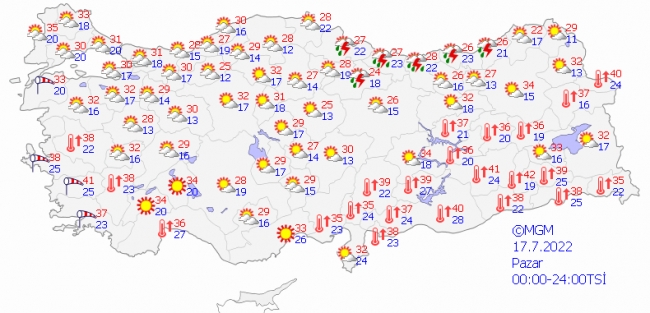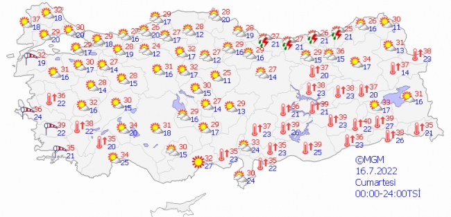 Hafta sonu yurdun tamamına yakınında yağış beklenmezken, en yüksek sıcaklık değerlerinin Ankara'da 30-32, İstanbul'da 29-31, İzmir'de 36-38, Antalya'da 34-36, Diyarbakır'da 39-42, Samsun'da 25-28, Adana'da 34-35, Erzurum'da 34-35 olması bekleniyor.