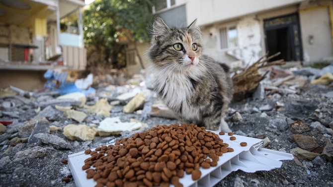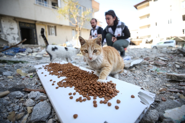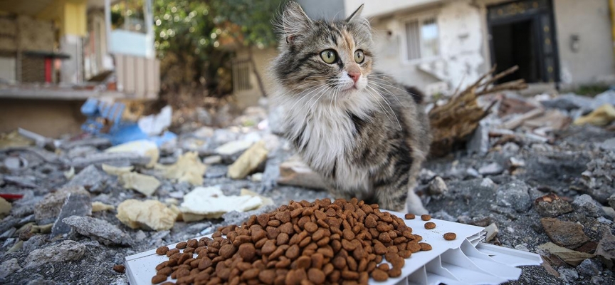 Türk Veteriner Hekimleri Birliği eş güdümündeki çalışmalar kapsamında, enkaz bölgeleri ile yaşam alanlarının çevresindeki kedi ve köpek gibi sahipsiz hayvanlar için mama bırakılıyor.