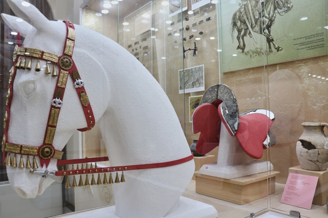 Bunların arasında milattan sonra 5. yüzyılda Hun askerinin kullandığı saf altın ile gümüş karışımından işlenen eyer ve dizgin dikkati çekiyor.