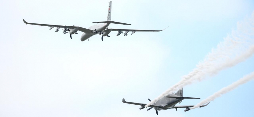Test uçuşu sonrası konuşan Bayraktar, "Tarihte ilk defa biri insansız iki uçakla uçuş gerçekleştirdi." dedi.