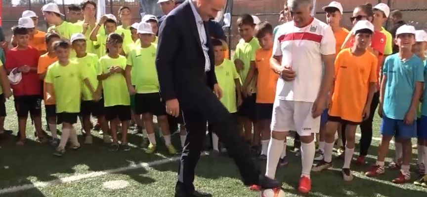 Yüzme, voleybol, basketbol ve futbol öğrencileriyle bir araya gelen Bakan Soylu, halı sahada penaltı kullandı, defalarca top sektirerek çevredekilerden alkış aldı.