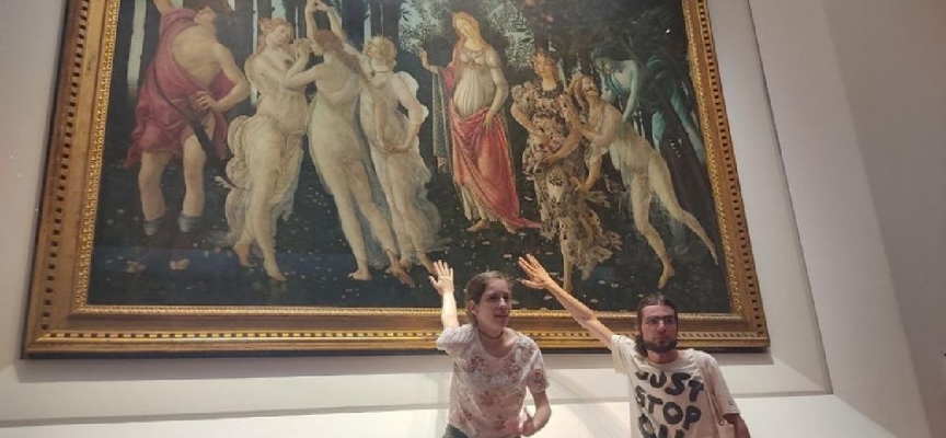 İki protestocu ellerini Botticelli’nin 15. yüzyıldan kalma şaheserini koruyan bir cam levhaya yapıştırırken, diğerleri fotoğraf çekip pankart okudu “gaz yok, kömür yok.”