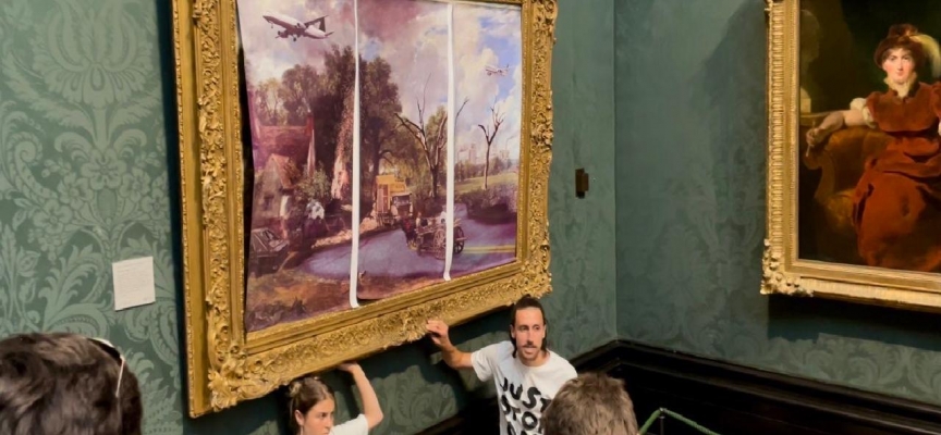 İngiltere hükümetinin yeni fosil yakıt ruhsatlandırma ve üretimini durdurmayı taahhüt etmesini sağlamak amacıyla kurulan iklim aktivisti grup Just Stop Oil grubu üyesi protestocular, Londra Ulusal Galerisi'ndeki 200 yıllık bir başyapıta kendilerini yapıştırdı.