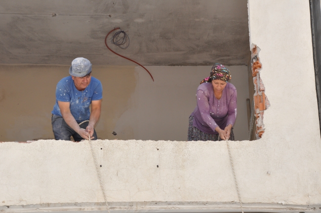 Harç karıp duvar yapan 4 çocuk sahibi çift, zorlu boya, badana, mantolama ve pencere takma işlemlerini birlikte üstleniyor.