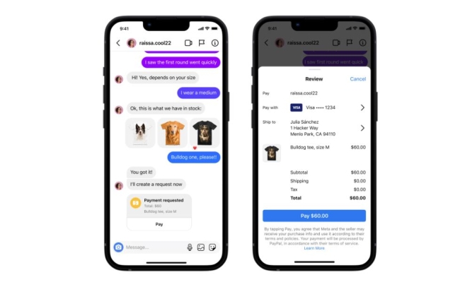 Meta tarafından paylaşılan bir ekran görüntüsü, bir alıcı satın almaya karar verdiğinde, satıcının ödeme talebi oluşturabileceğini gösteriyor. Bir kullanıcı "Öde" düğmesini seçtiğinde, ödeme bilgilerini ve teslimat adresini eklemeleri ve gözden geçirmeleri istenecektir. Ekran görüntüsü, "ödemenizin PayPal tarafından işleneceğini" gösteriyor.