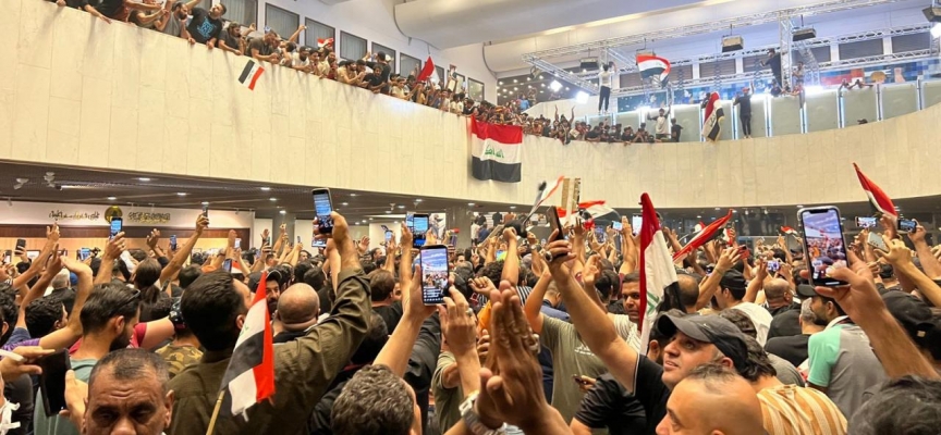 Şii lider Mukteda Sadr’ın çağrısı üzerine başkent Bağdat’taki korunaklı Yeşil Bölge’de bulunan parlamento binasını basan yüzlerce Sadr destekçisi, Yeşil Bölge ve parlamento binasını “Seyidin emrini yerine getirdik” sloganları ile terk etti.