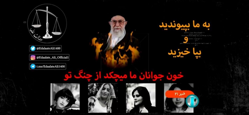 Ekrandaki fotoğrafların yanında, "Bize katılın ve ayağa kalkın" ve "Gençliğimizin kanı elinizden damlıyor" yazan bir mesaj ve hacker grubu Edaalat-e Ali'nin (Ali'nin Adaleti) sosyal medya hesapları yer aldı.