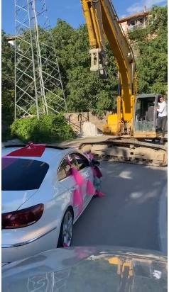 Çok sayıda davetlinin katılımıyla gelin alma merasimi de düzenlendi. Düğün konvoyunun geçişi sırasında bir kepçe operatörü de paletli iş makinesiyle yolu keserek, bahşiş istedi.