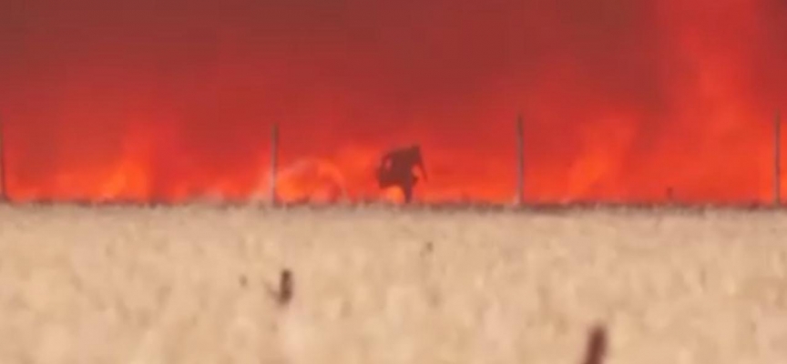 Alevlerle binaların arasına iş makinesiyle hendek kazdığı belirtilen Angel Marin Arjona isimli adam, bir anda yangının ortasında kaldı.