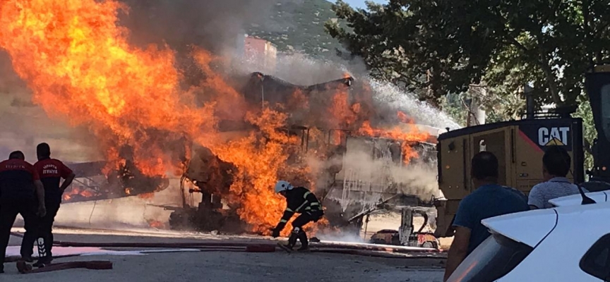 Metallerden çıkan kıvılcımın yol açtığı yangın sonucu iş makinesi alev aldı, bu sırada çalışma yapan 3 işçi yaralandı.