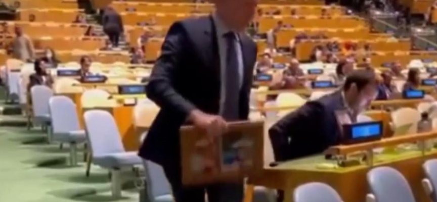 Reisi'nin 2 gün önce yaptığı, Holokost açıklamasına tepki gösteren İsrail'in Birleşmiş Milletler Daimi Temsilcisi Gilad Erdan, İsrail tarafına ait koltuğuna Holokost'tan kurtulan büyükanne ve büyükbabasının bir resmini bıraktıktan sonra salonu terk etti.