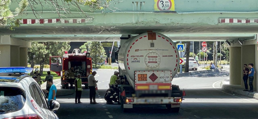 Ekipler, ön tarafı sıkışan tırın çıkarılması için köprünün altındaki yolun taşının bir kısmını çekiçle kırmak zorunda kaldı.