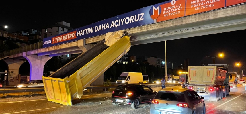 Ümraniye'de U.K. idaresindeki hafriyat kamyonunun, Şile yolunda Üsküdar istikametine seyir halindeyken Necip Fazıl Mahallesi mevkisinde açılan dorsesi yaya üst geçidine çarptı.